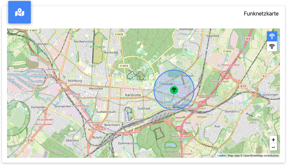 Auf der Karte ist markiert, an welchen Standorten sich die LoRaWAN-Gateways befinden. Die geschätzte maximale Reichweite des Netzes wird dabei von dem blauen Kreis um die Gateways markiert. Die tatsächliche Reichweite kann durch topografische Gegebenheiten beeinflusst werden. Sie können zusätzlich auch noch Sensoren in der Ansicht hinzuschalten.