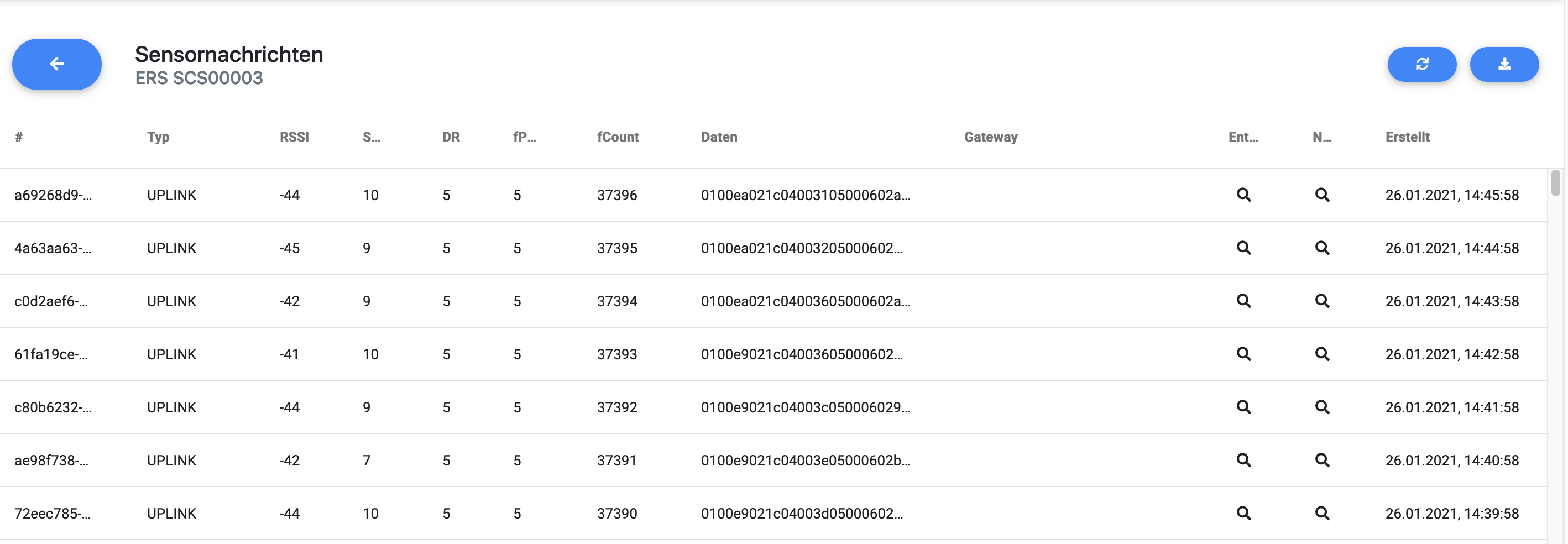 Sensornachrichten eines LoRa-Sensors als Tabelle