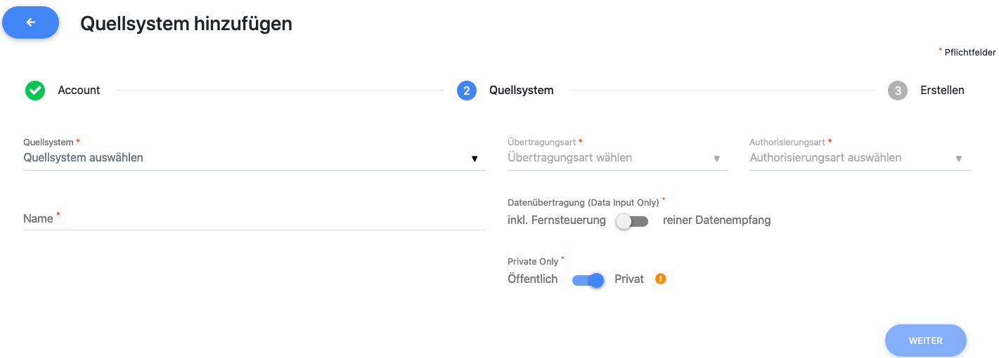 - Private Only: Auf Privat steht nur Ihrem Account das Quellsystem zur Verfügung, auf Öffentlich auch Ihren Subaccounts. Ein privates Quellsystem kann auf öffentlich umgestellt werden, ein Öffentliches aber nicht mehr auf privat.